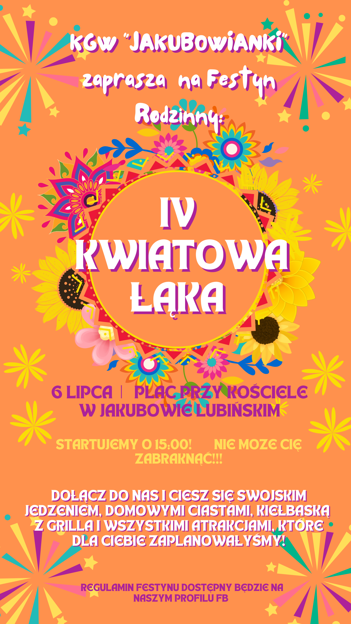 KGW „Jakubowianki” serdecznie zapraszają wszystkich mieszkańców i gości na IV Festyn Rodzinny „Kwiatowa Łąka”! 🌼